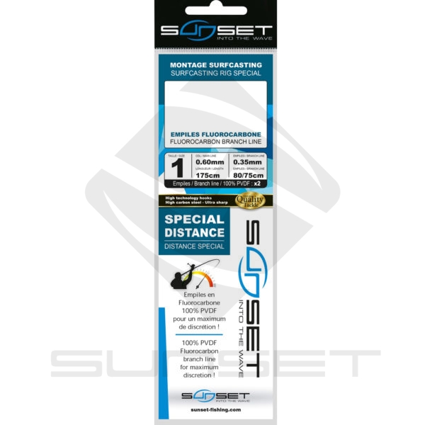 D’une longueur totale de 175cm, les bas de ligne SUNSET SURFCASTING SUNSET RS COMPETITION SPÉCIAL LONGUE DISTANCE / FLUORO 2 EMPILES sont disponibles en hameçon n°1.